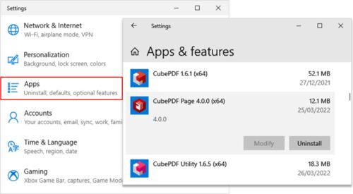 To uninstall CubePDF Page, first select Apps in Settings or Uninstall a program in Control Panel. Then select the CubePDF Page icon on the window that appears and run the Uninstall item.